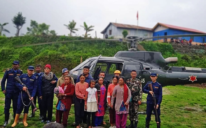पाँचथर । पाँचथरमा बाढी पहिरोका कारण फसेका १२ जनाको नेपाली सेनाको हेलिकोप्टरद्धारा उद्धार गरेको छ । अविरल वर्षापछि आएको बाढी र पहिरोका कारण आइतबार रातिदेखि फसेका ३ घरका १२ जनालाई आज बिहान सेनाको हेलिकप्टरमार्फत उद्धार गरिएको हो ।