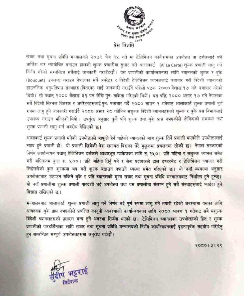 भारतीय सशुल्क अर्थात पे टिभी च्यानल प्रसारक संस्थाहरूले नेपालको ‘ आलाकार्ट ’ प्रणाली लागू गर्न सहयोग नगरेको सरकारको आरोप छ । आलाकार्ट शुल्क प्रणाली भनेको उपभोक्ताले आफूले हेर्न चाहेको च्यानलको मात्र शुल्क तिर्ने प्रणाली भएकोले यो उपभोक्तालाई हित हुने प्रणाली हो । यो प्रणाली छिमेकी देश लगायत विश्वका धेरै मुलुकमा प्रचलनमा छ।