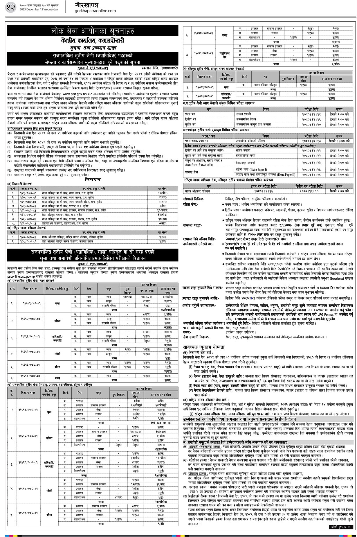 आयोगले २७३ जना अधिकृत नियुक्त गर्न खुला तथा समावेशी प्रतियोगितात्मक लिखित परीक्षाका लागि आवेदन मागेको छ । निजामतीतर्फका सामान्य प्रशासन, राजस्व, लेखा, लेखापरीक्षण, परराष्ट्र समूहमा २०३ जना, न्याय सेवा (न्याय, कानून र सरकारी वकिल समूह) तर्फ ६८ जना र मावअधिकार सेवातर्फ २ जना अधिकृत माग गरेको हो ।