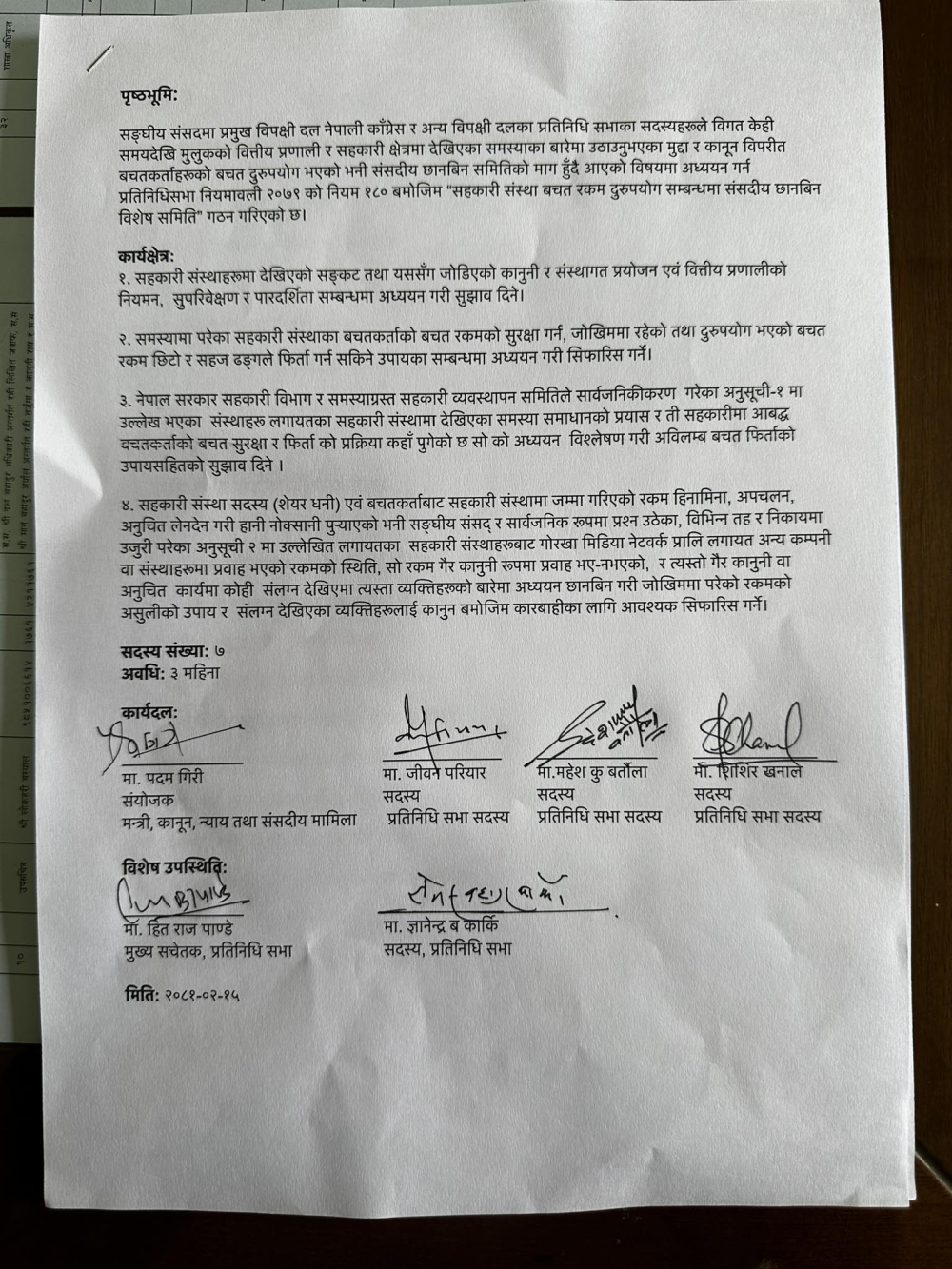 सहमतीअनुसार समितिमा सत्ता पक्ष र प्रतिपक्ष गरि ७ जना सदस्य रहनेछन् भने यसको अवधि तीन महिना हुनेछ । समितिले गृहमन्त्री रवि लामिछानेकोनाम जोडिएका सहकारी लगायत देशभरका २९ वटा सहकारीमा भएको अनियमितताबारे छानिबन गर्नेछ ।