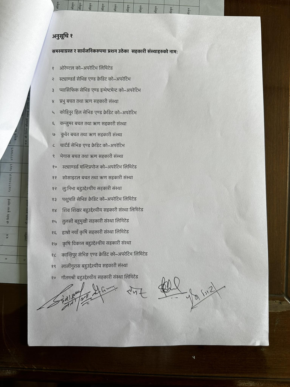 ३- नेपाल सरकार सहकारी विभाग र समस्याग्रस्त सहकारी व्यवस्थापन समितिले सार्वजनिकीकरण गरेका अनुसूची(१ मा उल्लेख भएका संस्थाहरू लगायतका सहकारी संस्थामा देखिएका समस्या समाधानको प्रयास र ती सहकारीमा आबद्ध बचतकर्ताको बचत सुरक्षा र फिर्ता को प्रक्रिया कहाँ पुगेको छ सो को अध्ययन विश्लेषण गरी अविलम्ब बचत फिर्ताको उपायसहितको सुझाव दिने ।