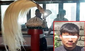 काठमाडौं । नारायणहिटी दरबार संग्रहालयमा प्रदर्शनमा राखिएको पूर्वराजाको श्रीपेच चोर्ने प्रयास गर्दै गर्दा एक युवक पक्राउ परेका छन् । फक्राउ पर्नेमा रुकुम पश्चिम मुसिकोट नगरपालिका–११ का २५ वर्षीय खेमबहादुर घर्ती रहेको प्रहरीले जनाएको छ । उनले संग्रहालय अवलकोन गरिरहेका बेला श्रीपेच रहेकै कोठाबाट खुकुरी निकालेर सिसा फुटाउन प्रयास गर्दै गर्दा समातिएका थिए ।